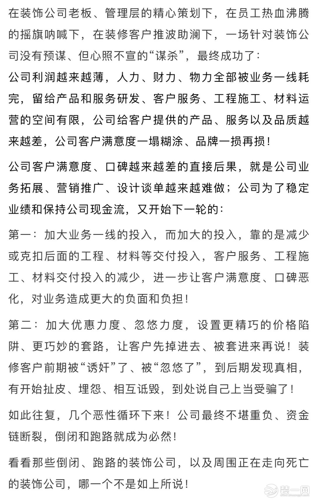 針對裝飾公司的倒閉、跑路潮,在這里給裝飾公司老板、管理層、員工以及裝修客戶提出如下的建議、忠告: