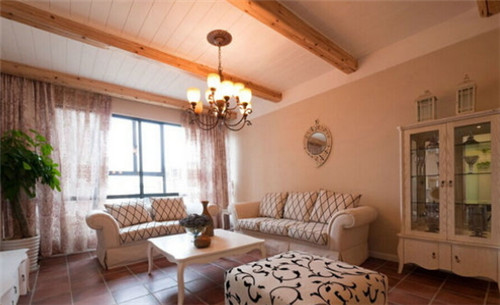 相比前面幾種歐式田園效果圖,這張效果圖更簡單一些,淡紅色地磚搭配米白色的沙發設計,給人一種自由、輕松的感覺。客廳中安裝的是落地窗,采光效果非常好,在靠窗的角落還擺放一盆綠色植物,給整個客廳增添一絲綠色生機。