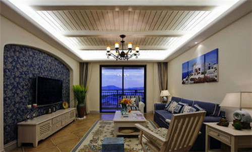 在這張客廳效果圖中,整體看起來非常雅致大方,處處體現著簡歐田園風光的味道。客廳中深藍色的柔軟沙發,搭配深藍色碎花的電視背景墻再合適不過。客廳地面采用的也是藍色花卉圖案的地毯,既顯得高貴又復古。