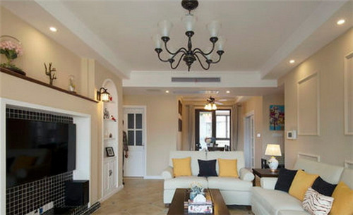在這古典高雅的客廳中,體現出一種歐式田園風格的氣息,客廳中采用簡約白色沙發為主,搭配實木質茶幾桌,地面又采用仿古式瓷磚拼花設計,給人一種復古的味道。電視背景墻采用的是黑色瓷磚正方格子設計,在客廳中顯得非常突出,深受人們的喜愛。